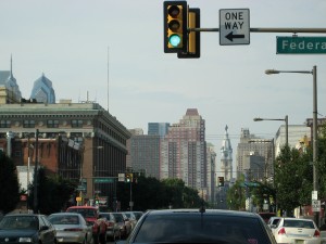 Auf der Fahrt zum Hotel sind wir vollauf mit Schauen beschäftigt. Die Fahrt dauert knapp 30 Minuten und schon bald tauchen die ersten Hochhäuser vor uns auf. Bald können wir auch den Turm des Rathauses erkennen mit der Statue von William Penn auf der Spitze.