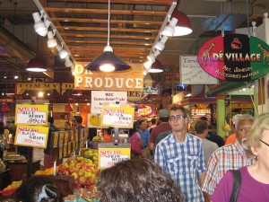 Vorbei am Denkmal von Benjamin Franklin, der hier begraben ist, und dem Eingang zu Chinatown gelangen wir schließlich zum Reading Terminal Market. Anders als in den Markthallen, die wir bisher z.B. in Südeuropa gesehen haben, ist das Warenangebot hier kunterbunt gemischt: frisches Obst und Gemüse direkt neben Schmuck, chinesisches Take away-Food gleich neben provencalischen Kräutern und Tischdecken … es ist ein Sammelsurium an Gerüchen und Geräuschen – leider etwas zu viel für Flo, der noch immer etwas Jet-Lag hat, deshalb verlassen wir die Markthalle recht schnell wieder.