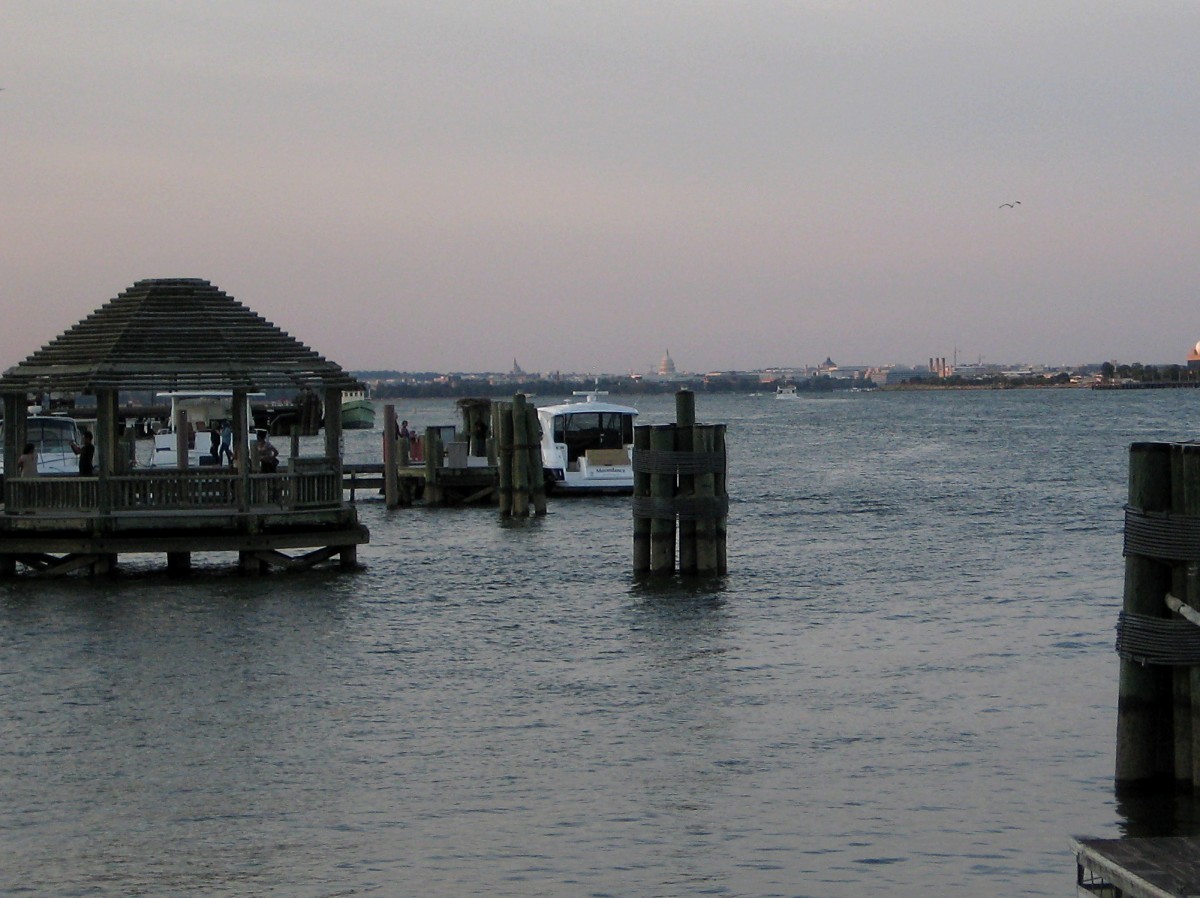 Wieder im Auto, fahren wir erst einmal ganz in Ruhe um das Pentagon herum und nehmen dann den Freeway nach Alexandria, eine Fahrt von nur wenigen Minuten. Wir parken vor dem Restaurant, haben aber noch eine knappe Stunde Zeit für einen Bummel. Ich bin begeistert von diesem pittoresken Ort mit den vielen hübschen Häusern und dem netten kleinen Hafen, von dem aus man am anderen Ufer des Potomac die Kuppel des Kapitols erkennen kann.