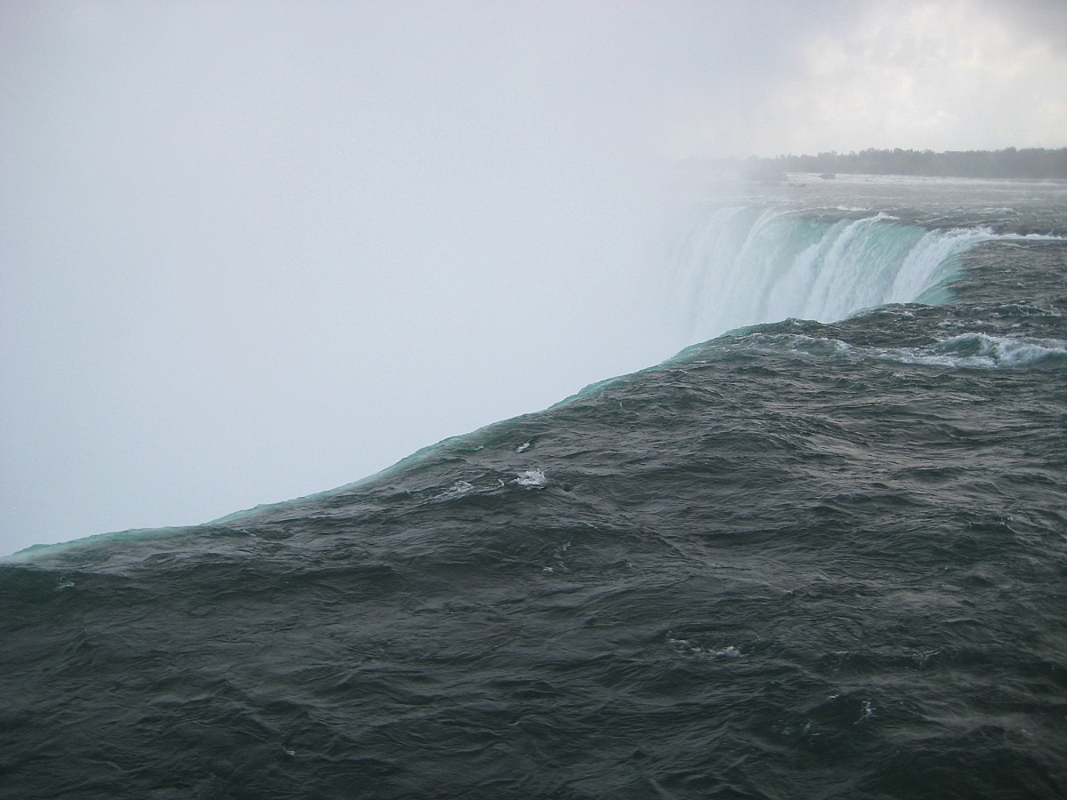 Uns wurde vorher gesagt, dass die kanadische Seite des Ortes Niagara Falls die lohnendere sei und das finden wir bestätigt, denn von dieser Seite aus hat man einfach den besseren Blick auf die Wasserfälle. Ich kann mich gar nicht satt sehen an den Wassermassen, die wild tosend bergab stürzen. Wir bummeln auf dem Fußweg oben am Steilufer entlang bis zu den Horseshoe Falls, die ihren Namen äußerst nachvollziehbar ihrer Form zu verdanken haben. Unter uns ist die Anlegestelle der kanadischen „Maid of the Mist“-Schiffe, die ganz dicht bis an die Fälle heran fahren. Die Leute an Bord tragen alle bunte Regenjacken. Uns reicht es, von oben zuzuschauen.