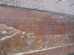 Wir verzichten darauf, das Visitor Center zu besuchen, denn auch so wird man auf Schritt und Tritt an 9/11 erinnert. An einer Wand ist ein großes Relief eingelassen: „Dedicated to those who fell and to those who carry on. May we never forget.“ Daneben ein Bild mit Feuerwehrleuten, die damals ihr Leben gelassen haben.