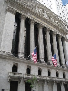 Zurück an Land nehmen wir die Broad Street (die entgegen ihres Namens gar nicht so groß ist und über weite Teile sogar eine Fußgängerzone) und gelangen so zur Wall Street mit der New York Stock Exchange. Da es fürchterlich heiß ist, lassen wir uns auf einer Treppenstufe im Schatten nieder und schauen eine ganze Weile dem bunten Treiben zu, denn natürlich wimmelt es hier nur so von Touristen aus aller Welt.
