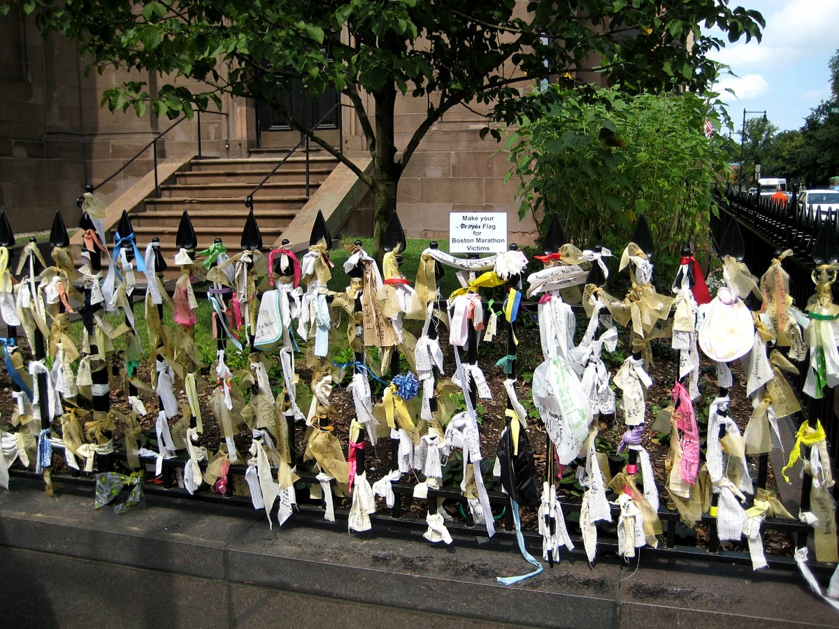 Als wir von dort aus die Boylston Street entlang schlendern, sehen wir schon von Weitem am Gitterzaun vor einer Kirche jede Menge bunter Schleifen hängen. Beim Näherkommen stellt sich heraus: Es handelt sich um eine Gedenkstätte für die Opfer des Terroranschlages beim Boston Marathon, der sich genau hier am 15. April 2013 ereignet hatte. Nun fällt uns auch auf, dass unglaublich viele Leute ein T-Shirt mit der Aufschrift „Boston Strong“ tragen, als Zeichen der Solidarität.