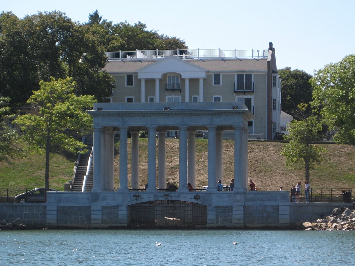 Nach etwa drei Stunden kehren wir zur Anlegestelle zurück und nun fahren wir mit dem Auto tatsächlich noch ins City Center von Plymouth, um dort noch etwas bummeln zu gehen. Nun besichtigen wir den Plymouth Rock von der Landseite aus. Hierbei handelt es sich um den „geschichtsträchtigsten Stein Amerikas“ (Zitat Baedeker Reiseführer). Der Legende nach ist das der Stein, den die Pilgerväter bei ihrer Ankunft als ersten betraten. Später sollte dieser Stein ein paar Mal hin- und hergeschoben werden, wobei er in zwei Teile zersprang – was dem sonst eher unscheinbaren Felsbrocken dann doch noch eine nette Anekdote verpasst hat.