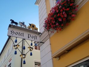 Dann stiegen wir wieder ins Auto und fuhren nach Murnau. Da es für den Besuch des Münter-Hauses noch zu früh war (es öffnet nachmittags erst um 14 Uhr), unternahmen wir zuerst einen Bummel in Richtung Altstadt und kehrten unterwegs in einem italienischen Lokal ein, aus dem es verführerisch duftete. Dort konnten wir im schönen Garten herrlich sitzen und genießen. Die Fußgängerzone von Murnau ist ausgesprochen einladend: Es gibt dort wunderschöne Häuser, mehrere Brunnen und sehr viele interessante Läden, auch abseits der sonst üblichen Ketten. Da das Wetter so schön war, waren viele Leute unterwegs oder saßen gemütlich auf den Terrassen der Cafés und Lokale, es herrschte eine sehr entspannte Atmosphäre und wir fühlten uns wie im Urlaub.