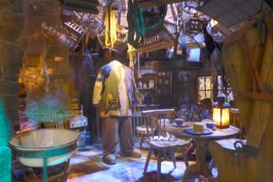 Hier machte es ganz besonders viel Freude, das Aufleuchten in den Augen unserer Söhne zu sehen, die etwas später als Jens und ich aus dem Verbotenen Wald herauskamen. Den Hogwarts-Express kann man auch von innen besichtigen, dort gibt es mehrere Zugabteile, die jedes im Stil eines Films dekoriert sind. Man kann also an den Sachen, die in den Abteilen herumliegen, ablesen, wie die Hogwartsschüler allmählich von Kindern zu Teenagern wurden. Und hier kamen wir auch – ganz ohne Schlangestehen wie am Bahnhof King’s Cross – noch zu unseren Fotos mit Gepäckwagen.