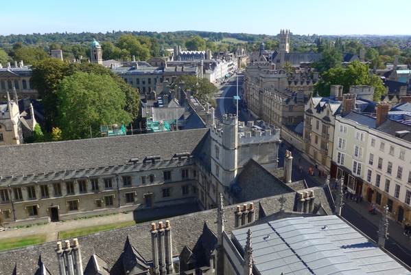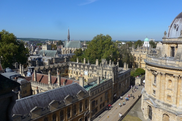 Von hier waren es nur wenige Schritte zur University Church of St. Mary the Virgin: Manuela hatte mir den Tipp gegeben, hier den Turm zu besteigen, weil man dort einen traumhaften Rundumblick auf die ganze Stadt hat. Recht hatte sie! Hier kommen die Bilder von unserem Ausblick im Uhrzeigersinn, beginnend im Norden: