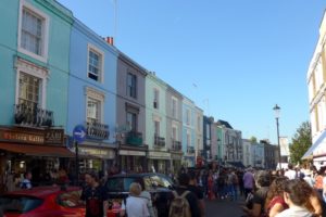 An diesem Samstag ließen wir es ruhig angehen. Ich nutzte den Vormittag, um eine Maschine Wäsche zu waschen, vor allem mit Kleidung von Felix, denn anders als der Rest der Familie würde er am Montag nicht nach Hause, sondern gleich weiter nach Bremen reisen und dort noch fünf Tage bleiben, also brauchte er frische Wäsche. Gegen Mittag nahmen wir den Bus 328 zum Notting Hill Gate und tauchten ein in den Trubel am Portobello Market. Und natürlich durfte auch ein Fotostopp am Notting Hill Book Shop (bekannt aus dem Film „Notting Hill“ mit Julia Roberts und Hugh Grant) nicht fehlen:
