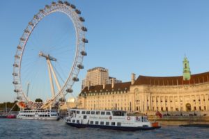 Nach dem Aussteigen am Westminster Pier bewunderten wir noch einmal das London Eye, das herrlich in der Abendsonne glänzte: