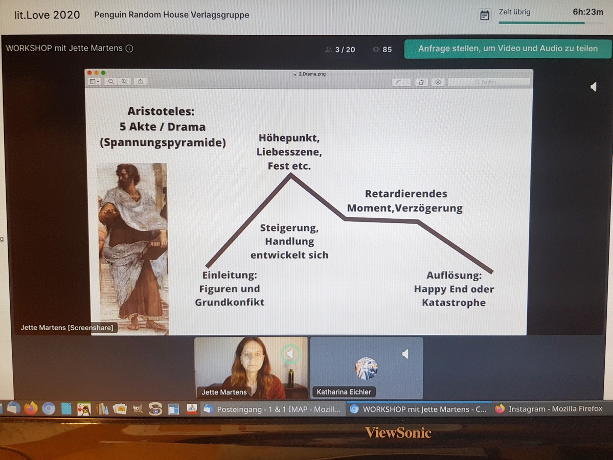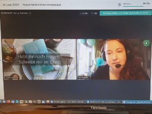 Mit Ivy Andrew ging es auch beim nächsten Programmpunkt weiter. Da für ihren Talk mit Jette Martens um 14 Uhr aber 40 Minuten veranschlagt waren und ihr Workshop in einem anderen virtuellen Raum bereits um 14.30 Uhr begann, war ich neugierig darauf, wie das wohl gelöst würde. Die Antwort: Der Workshop „Die Inszenierung – richtig fotografieren für Instagram“ begann mit einer vorbereiteten Präsentation, die lange genug dauerte, dass Ivy sich anschließend live einklinken konnte. In ihrem Workshop ging es um die richtigen Lichtverhältnisse, darum, für die Fotoinszenierung die Farben des Buchcovers aufzunehmen und um geeignetes Dekomaterial. Das sammelt sie eigens in einem Karton, um es für Fotos zu verwenden. Da konnte ich nur staunen. Aus mir wird definitiv keine Deko-Queen mehr, dafür haben die Instagram-Bilder meiner Buchrezensionen alle das gleiche Design und insofern Wiedererkennungswert, was ja wiederum Maren Vivien Haase zuvor gepredigt hatte.