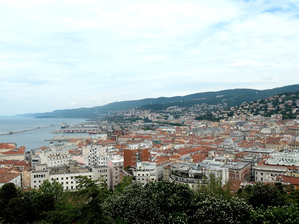 Als Unterkunft entschieden wir uns für eine Ferienwohnung, nicht zuletzt deshalb, weil wir zum Zeitpunkt der Buchung noch nicht wussten, wie sich die Corona-Situation wohl entwickeln würde, und in einer Ferienwohnung kann man sich dann halt doch ungezwungener bewegen als in einem Hotel. Unsere Wahl fiel auf die zentral gelegene Residenz „Le Terrazze“, die zwar eher spartanisch eingerichtet war, aber wir wollten dort ja nur übernachten und den Kühlschrank nutzen, aber nicht groß kochen. Das Highlight der Wohnung und der Grund, warum wir uns dafür entschieden haben, war die Dachterrasse mit einem genialen Blick über Triest, der uns selbst an unserem Ankunftstag, als es zunächst noch ein wenig genieselt hat, begeistern konnte: