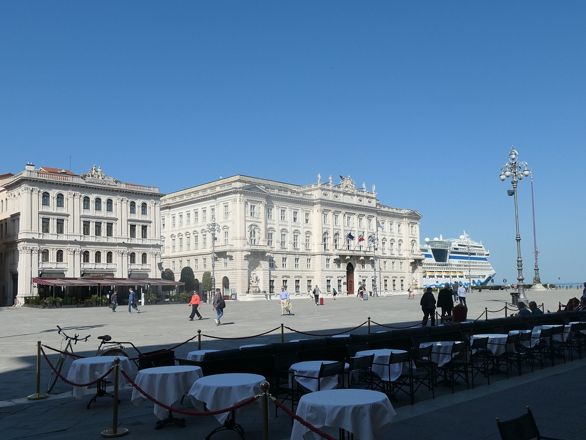 Von dort waren es nur noch wenige Schritte entlang der Hafenpromenade bis zur Piazza dell‘ Unità d’Italia, kurz Piazza Unità genannt. Es soll sich dabei um einen der größten Plätze Europas, die auf einer Seite zum Meer hin geöffnet sind, handeln. Gesäumt ist er von vielen Prachtbauten wie dem Rathaus und dem Gebäude des Lloyd Triestino, dem ehemaligen österreichischen Lloyd, und da hatte ich gleich den ersten Bezug zu den oben erwähnten historischen Romanen. Uns zog es aber nun vor allem in das berühmte „Caffè degli Specchi“, zu deutsch: Spiegelcafé:
