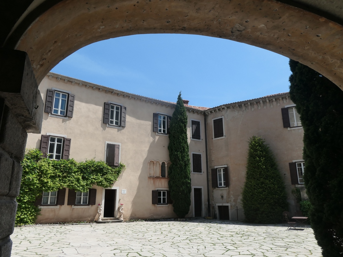 Nach der Besichtigung genossen wir noch einen Kaffee im Schlosspark, bevor wir uns wieder auf den Rückweg zum Auto machten. Unser nächstes Zwischenziel hieß Duino. Auch dort gibt es eine Burg, außerdem ist der Ort bekannt, weil der Dichter Rainer Maria Rilke einige Zeit dort verbracht hat. So gibt es dort auch einen Rilke-Spazierweg, der von Duino bis ins benachbarte Sistiana führt. Uns zog es zunächst zur Burg. Die ist in Privatbesitz, weshalb nur ein Teil zugänglich ist, der auch für Konzerte, Kongresse, Hochzeiten und andere Veranstaltungen genutzt wird. Vor allem vom Turm aus bietet sich ein fantastischer Ausblick in Richtung Osten bis nach Miramare und Triest und im Westen zur nahen Stadt Monfalcone und zur dahinter liegenden Lagunenlandschaft.