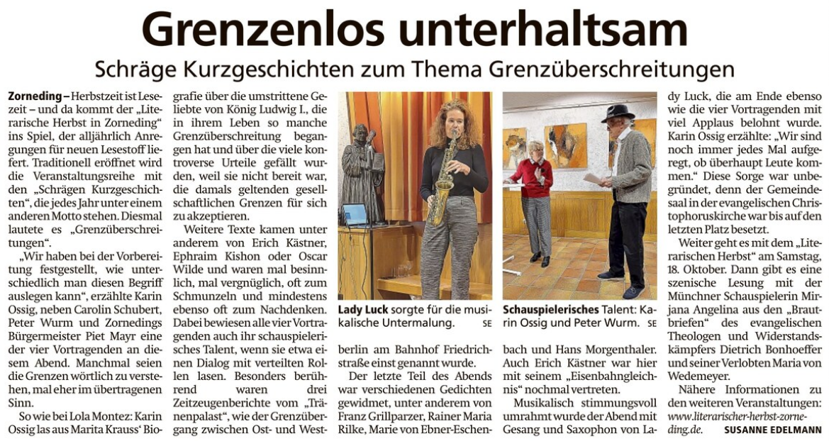 Traditionell startet die Reihe mit einem Abend rund um schräge Kurzgeschichten, die jedes Jahr unter einem anderen Motto stehen. Heuer lautete das Motto „Grenzüberschreitungen“ und wie in jedem Jahr las das Veranstalterteam – Peter Wurm, Karin Ossig und Carolin Schubert – zusammen mit Zornedings Bürgermeister Piet Mayr abwechselnd oder gemeinsam lustige und nachdenkliche Gedichte, Essays, Kurzgeschichten und andere Texte. Für die musikalische Umrahmung sorgte Lady Luck mit Saxophon und Gesang: