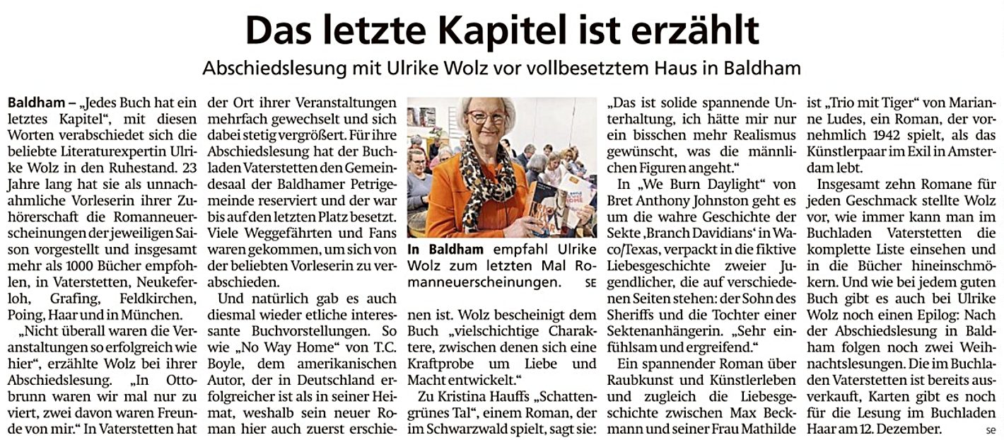 Kaum zurück daheim, wurde es Anfang November etwas wehmütig: Seit Jahrzehnten (!) bin ich ein großer Fan der Literaturlesungen von Ulrike Wolz. Die Journalistin und Literaturexpertin aus meiner Heimatgemeinde stellte 23 Jahre lang regelmäßig ihre jeweils aktuellen Romanhighlights vor – und das auf so unnachahmliche Weise, dass man ihr begeistert lauschte, selbst wenn einen das vogestellte Buch selbst gar nicht sooo sehr interessierte. Nun verabschiedete sie sich in den Ruhestand: nach 23 Jahren und über 1000 vorgestellten Büchern. Für die Abschiedslesung reichte der Platz im Buchladen Vaterstetten nicht aus, so dass stattdessen der Gemeindesaal unserer evangelischen Kirche gebucht wurde. Der war bis auf den letzten Platz besetzt, weil so viele Weggefährt*innen gekommen waren: