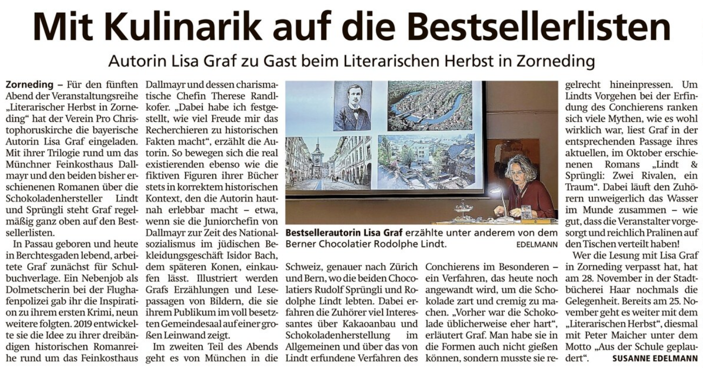 Nur zwei Tage später ging es erneut zum Literarischen Herbst nach Zorneding und für mich zu einem absoluten Highlight: Hier las nämlich die Autorin Lisa Graf aus ihren beiden Romanreihen „Dallmayr“ und „Lindt & Sprüngli“. Es war ein sehr herzliches Wiedersehen, nachdem ich Lisa Graf bereits auf der Buchmesse kurz getroffen und auch zuvor schon viele ihrer Lesungen in unserer Region besucht hatte. Zur Lesung waren die Tische schön und ausgesprochen lecker dekoriert. Lisa Graf erzählte von der Entstehung ihrer beiden Buchreihen, las einige Passagen und zeigte auf der Leinwand in einer Power Point-Präsentation Fotos und alte Dokumente dazu – das war für mich eine Neuerung, denn bei den Lesungen, die ich bisher besucht habe, hatte sie die Bilder stets auf eine Stellwand gepinnt. So aber war es natürlich viel komfortabler. Außerdem nutzte ich die Gelegenheit, mir ihren aktuellen Roman „Lindt & Sprüngli – Zwei Rivalen, ein Traum“ signieren zu lassen.